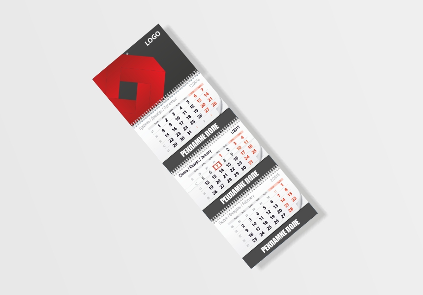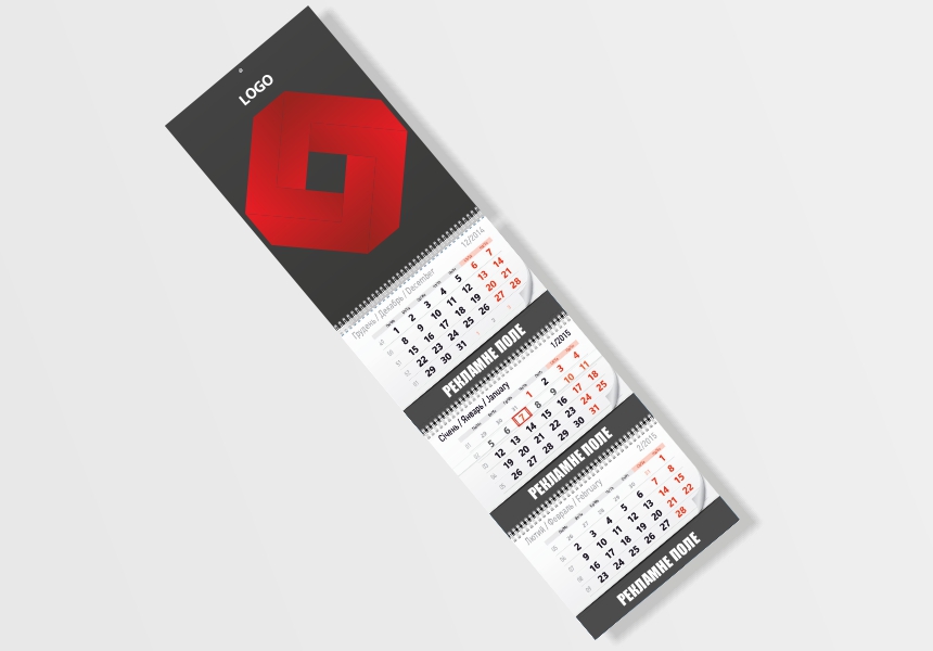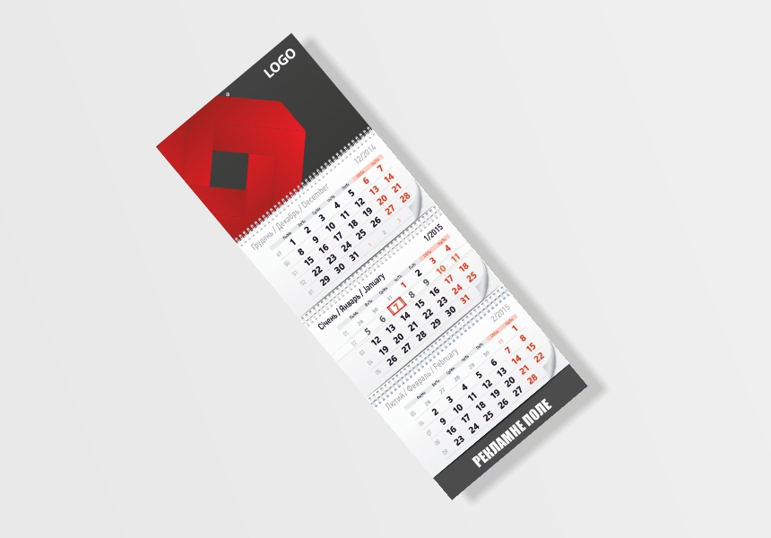 Квартальний календар А3, 3 календарних блоки, 1 рекламне поле