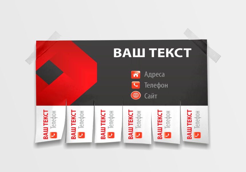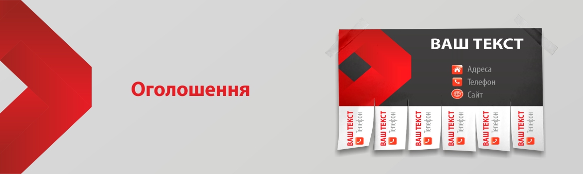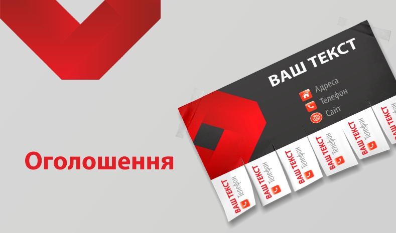 Оголошення формату А5. Матеріал: крейдований папір 130 г/м. Кольоровий друк з однієї сторони
