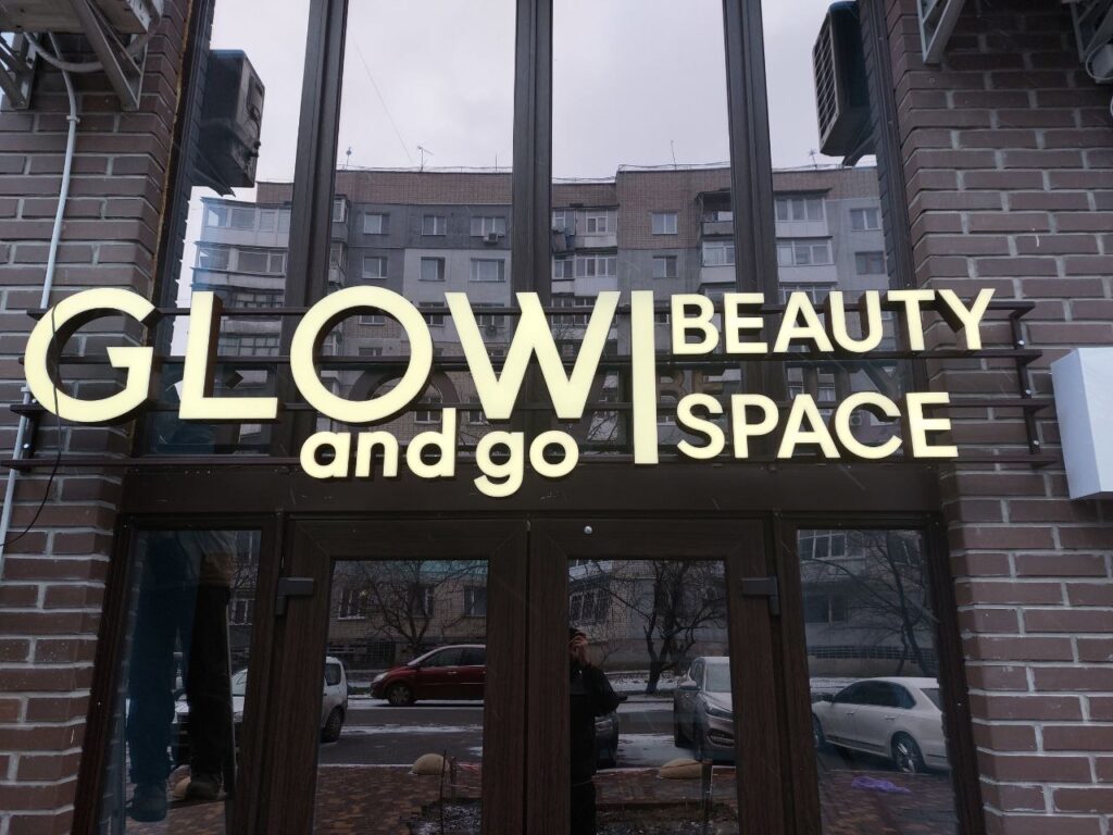 • Вивіски з підсвіткою типу “контражур” — світло спрямоване на стіну позаду букв, створюючи ефектний ореол.
